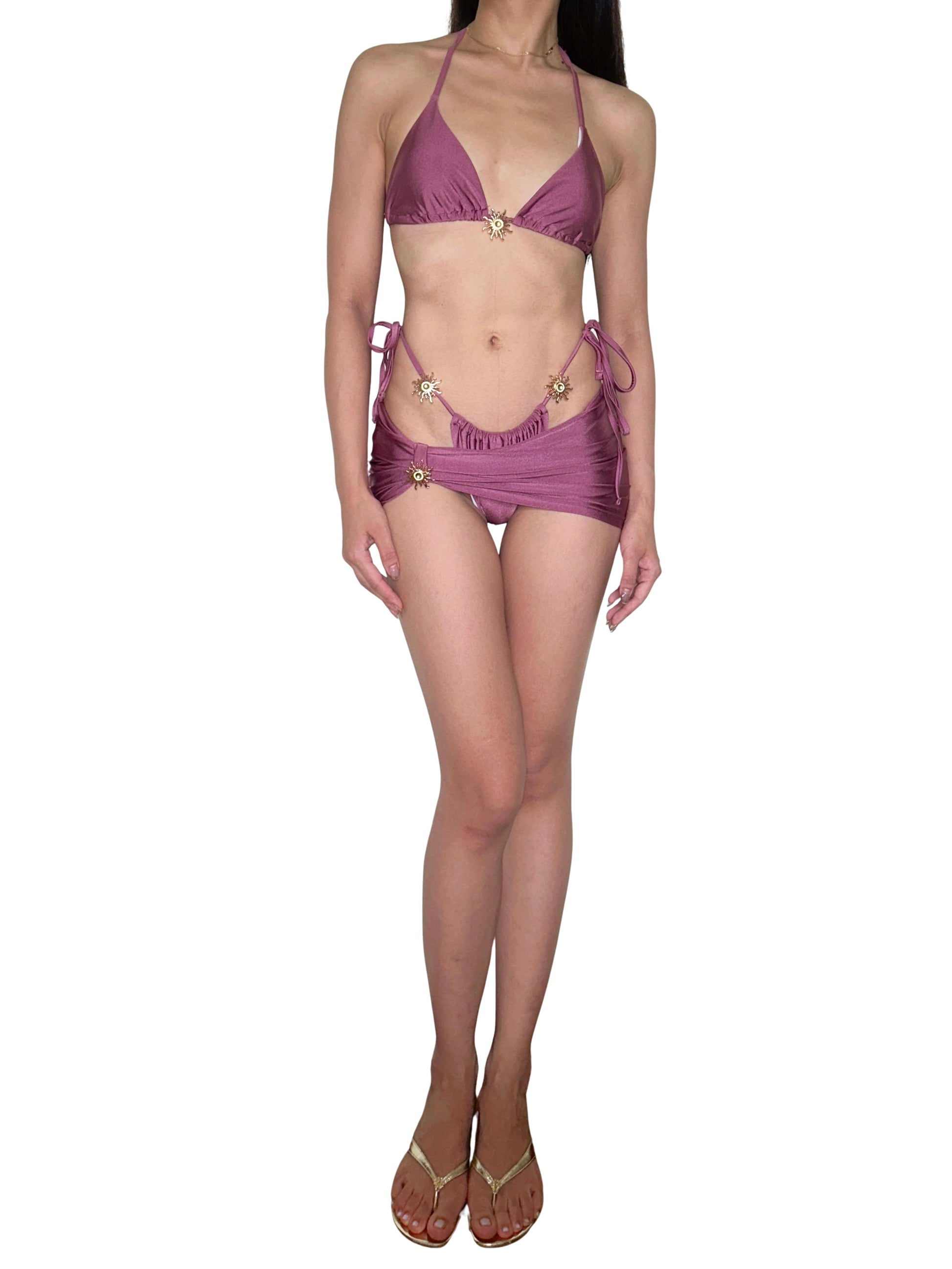 This 3-piece purple bikini set features a luminous shimmer fabric that subtly enhances your natural curves. The design includes striking metal totem-inspired sun jewellery plates, adding a bold yet balanced aesthetic. Lightweight and comfortable, it provides a secure fit while making a statement at the beach or pool. Perfect for those who love mermaid-inspired glamour with a touch of bohemian flair.